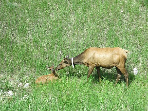 ELK,牠是女生(頭上沒有長角),蹲坐在草叢中的小ELK受了傷,無法行走,司機兼導遊的Joe馬上電話通報Parks Canada國家公園警察隊,不到5分鐘的時間就有兩輛車趕來處裡,這樣保育動物的效率,AWESOME!!